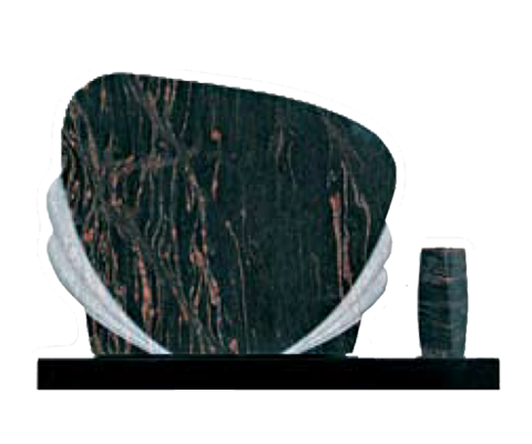 Aszimmetrikus, organikus formájú síremlék, amelynek egyik oldala világos szegélyt kapott. A képen látható zöldes-fekete erezet játékosságot és egyediséget ad a kőnek, amely természetesen más anyaggal is választható.