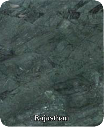A Rajasthan mélyzöld, kékes-zöld kőzete a trópusi erdők misztikus árnyait idézi. Szálas, márványos erezete vadregényes, természetközeli hangulatot kölcsönöz, így a síremlék szinte a természet ölelését hordozza.